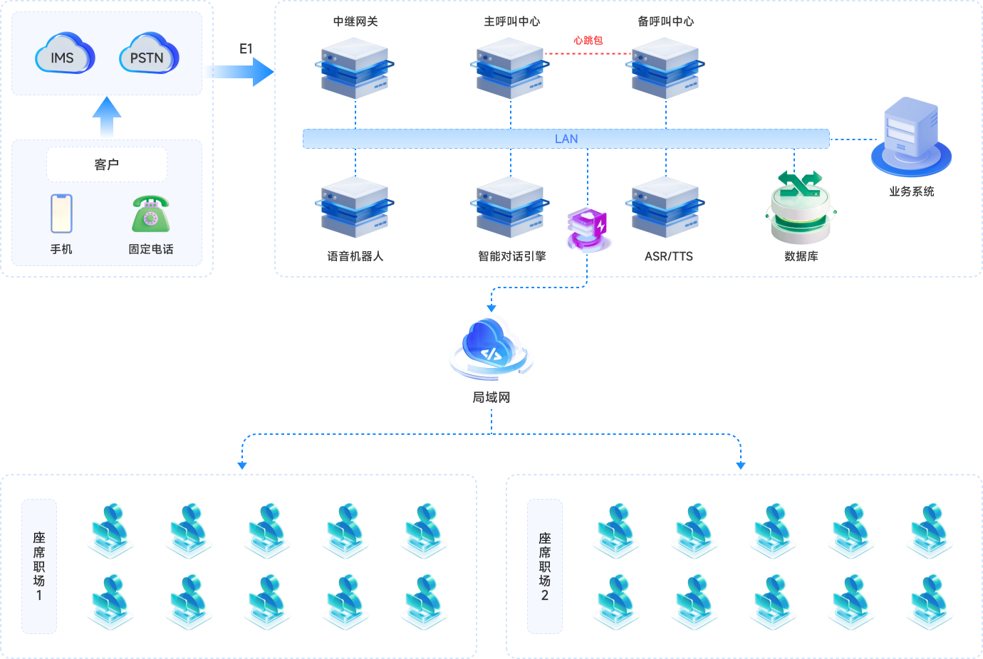 呼叫中心平台由服务商部署在企业本地,使用企业自己的中继线路呼入呼出。