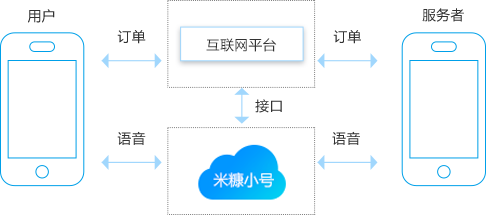 - 用户通过平台产生订单或咨询,由心理咨询师提供服务。用户通过米糠小号与服务者进行电话沟通,相互拨打米糠小号联系到对方,建立起隐私保护机制。